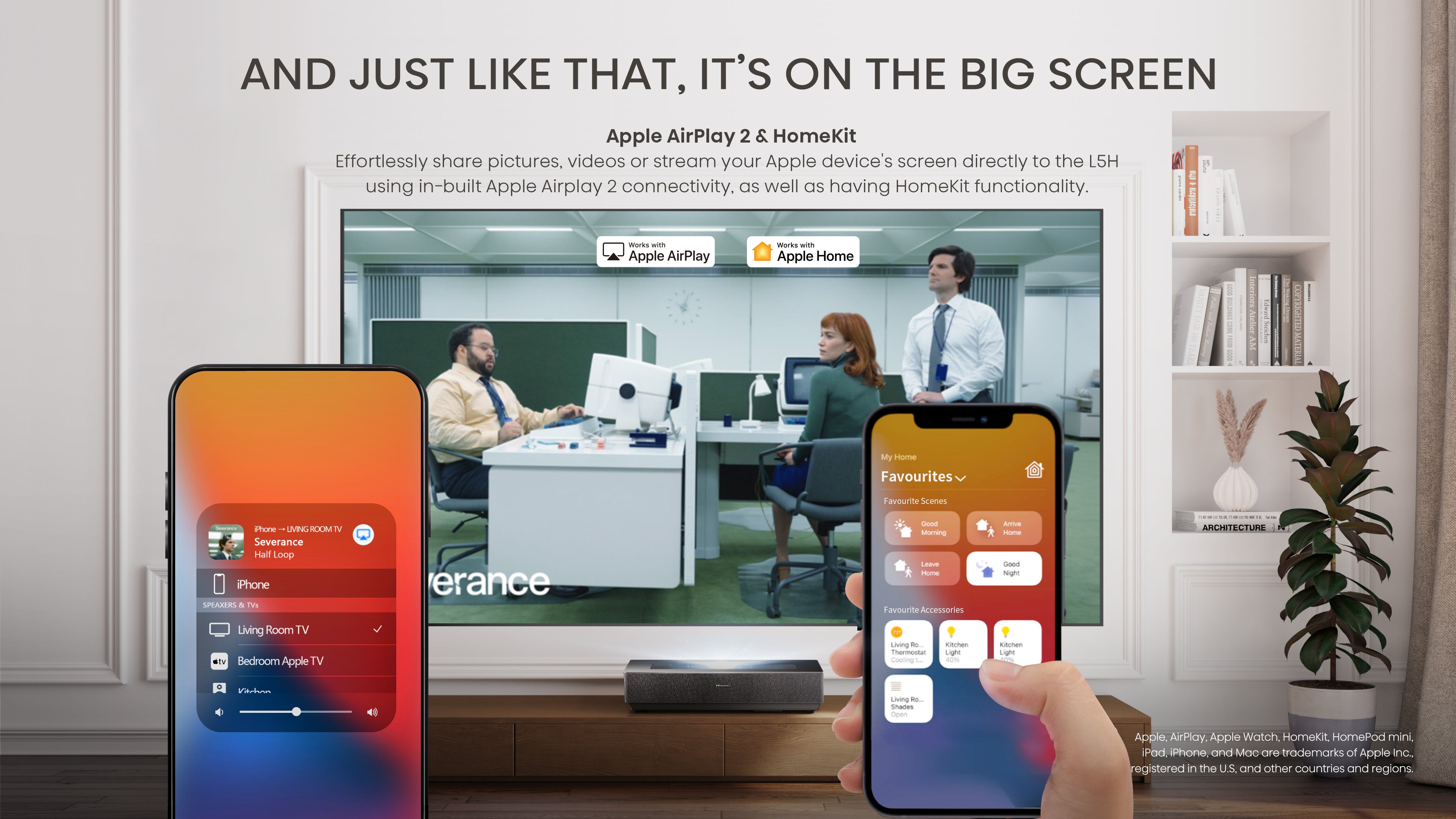 Effortlessly share pictures, videos or stream your Apple device's screen directly to the L5H using in-built Apple Airplay 2 connectivity, as well as having HomeKit functionality.