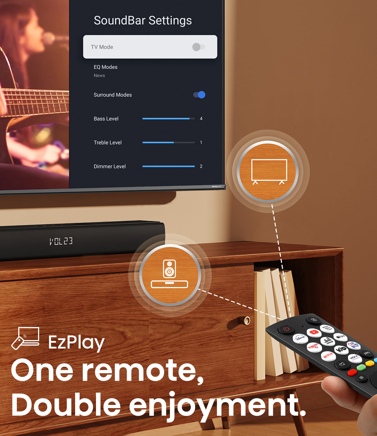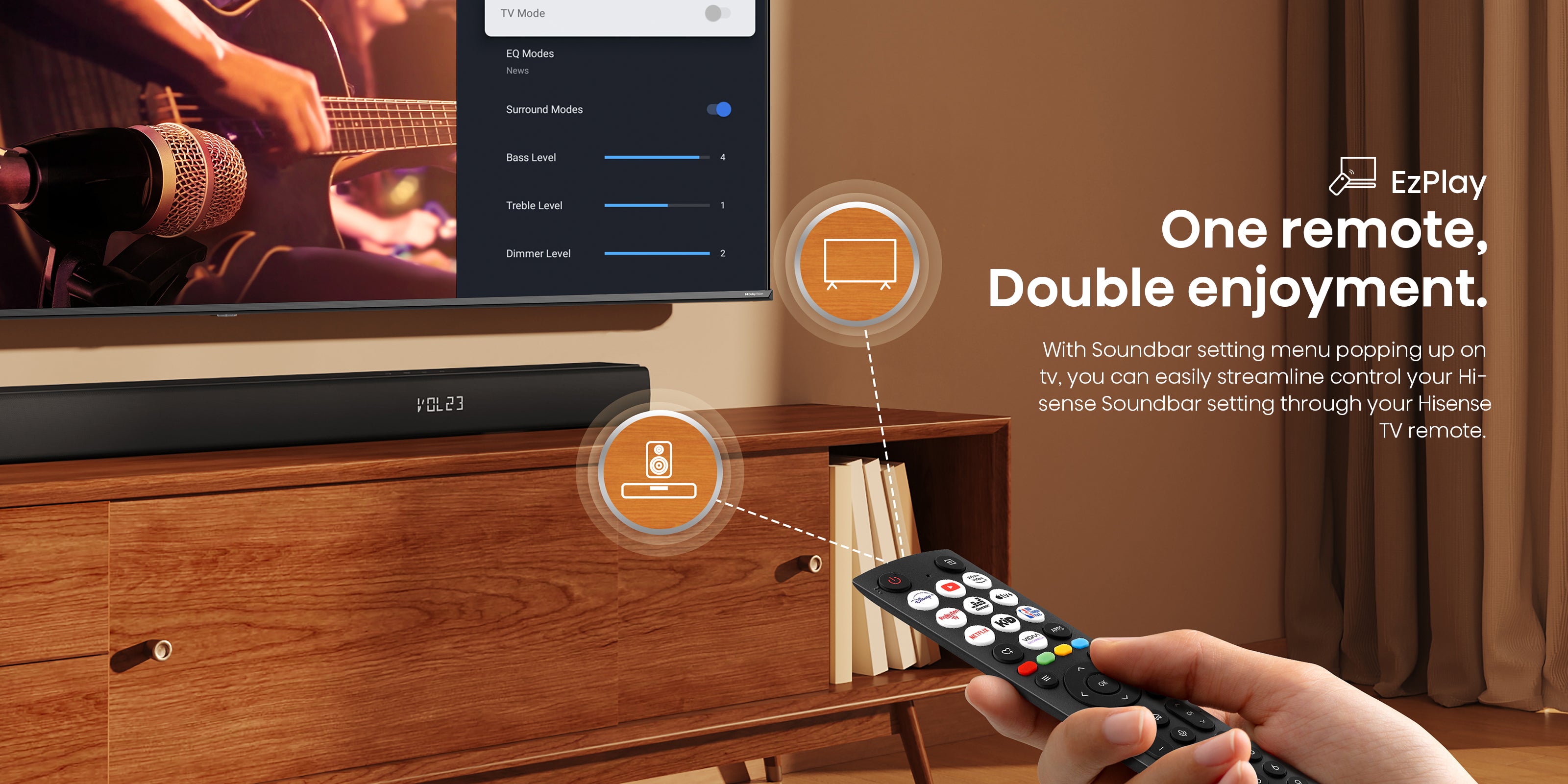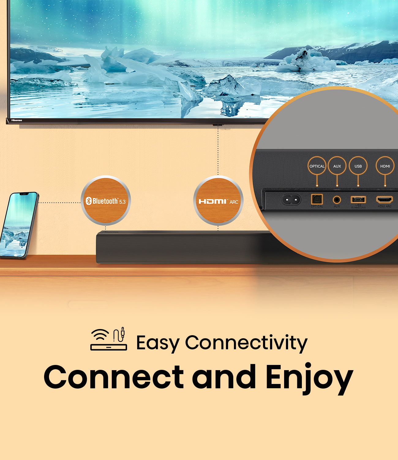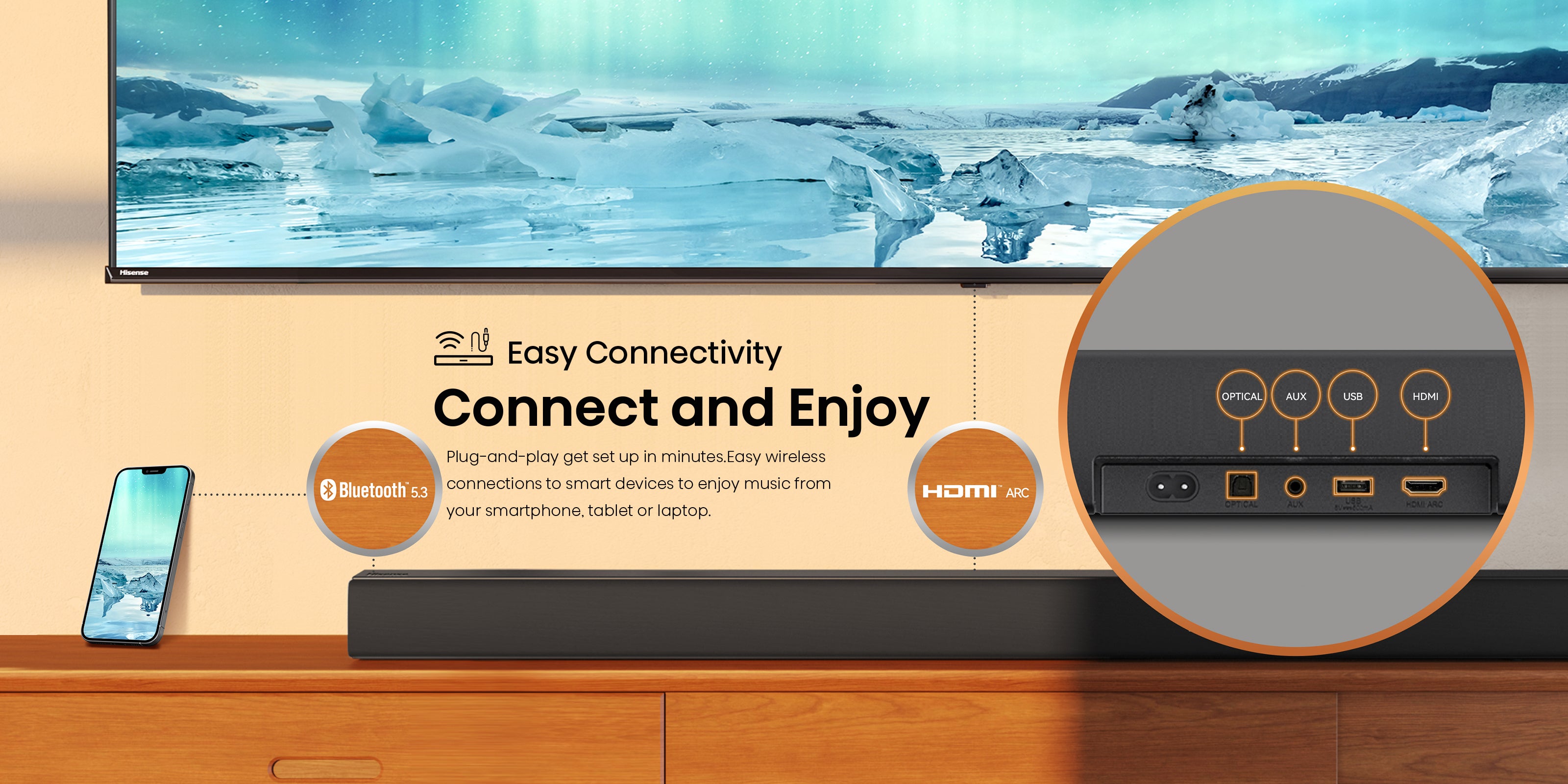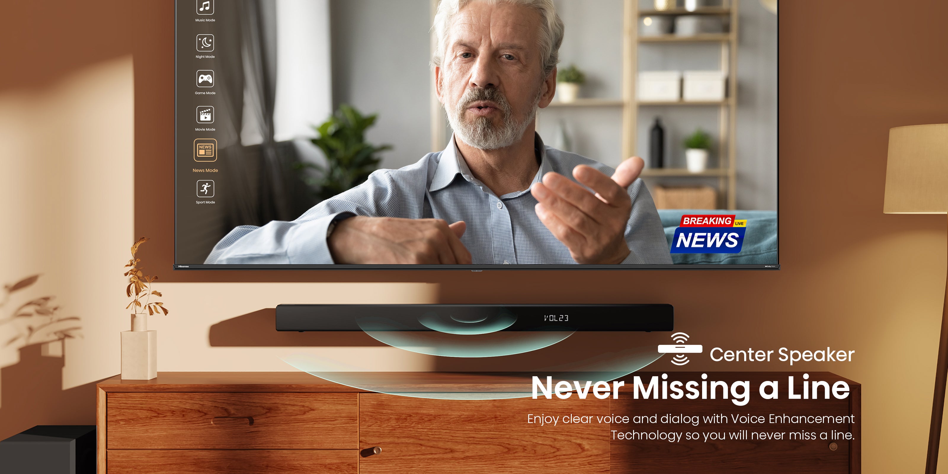 With TV mode technology, when connected to compatible Hisense TVs, you can fully leverage your TV's sound capabilities through the soundbar speakers, enhancing your audio experience for truly immersive sound.