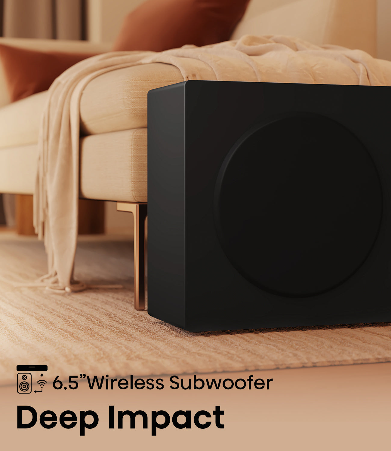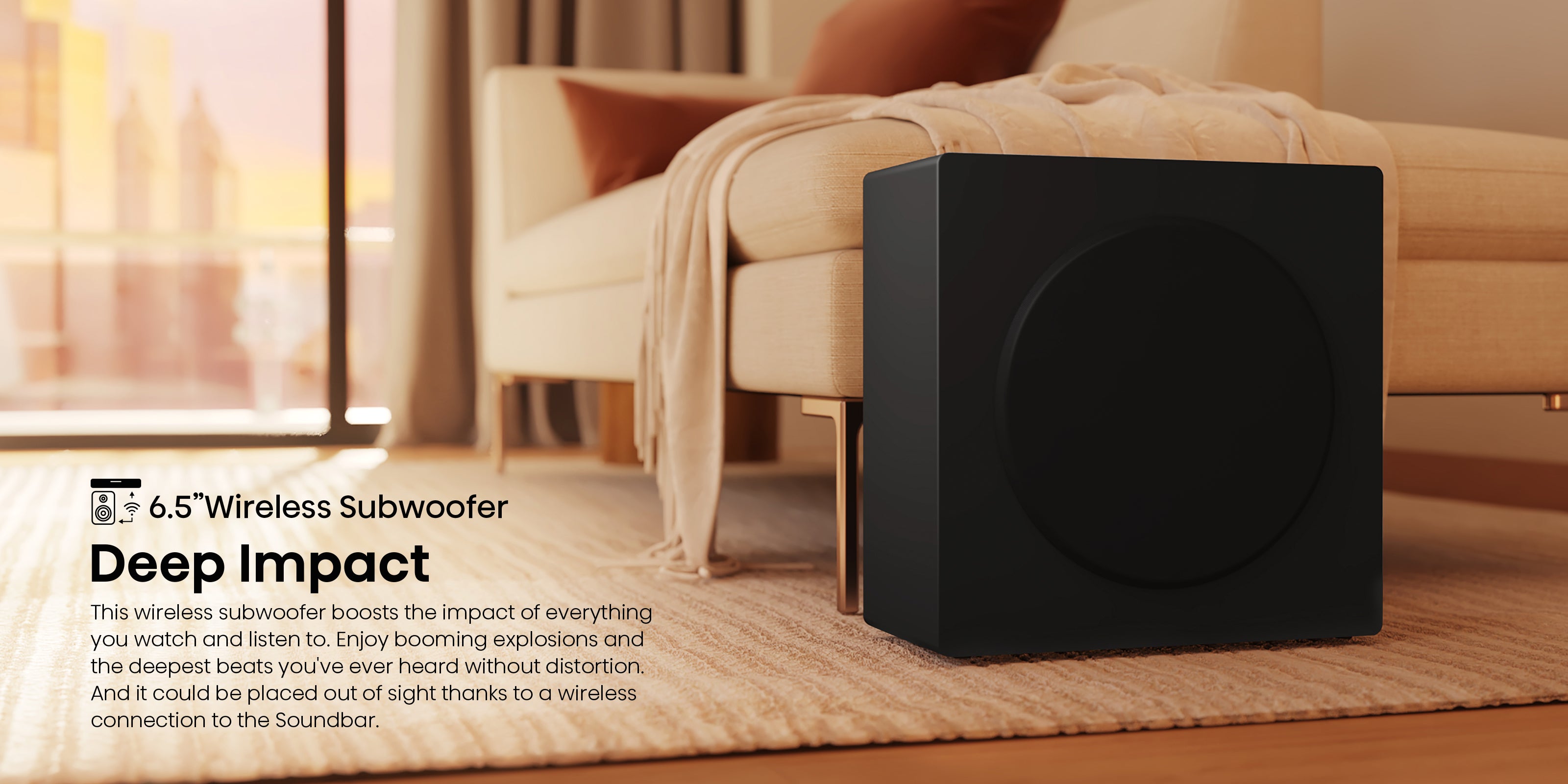 Experience deeper, richer bass with a powerful wireless subwoofer that connects effortlessly. Enjoy the freedom to place it anywhere you choose for optimal sound.