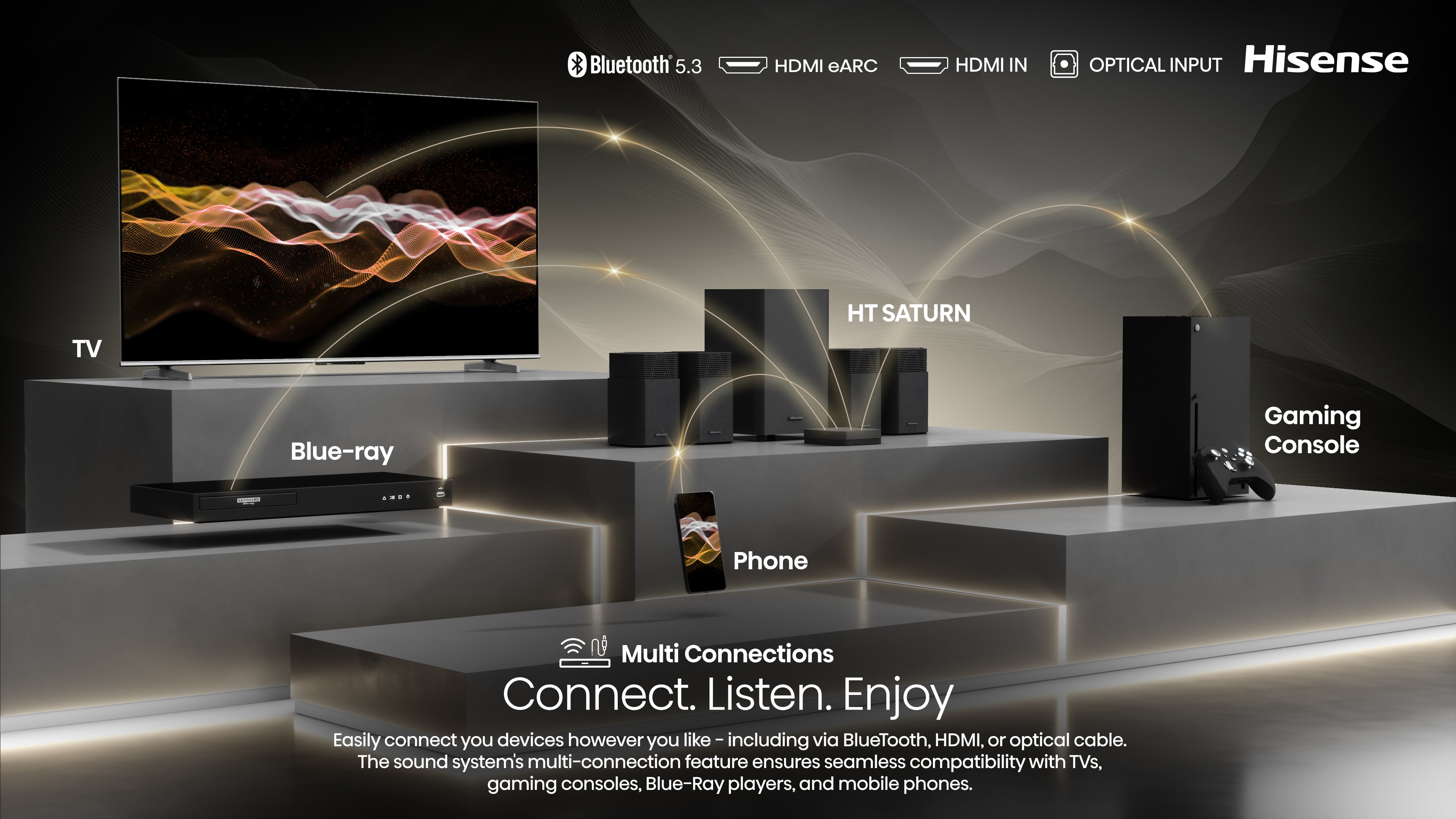 - Multiple connection options including HDMI eARC and Bluetooth make elevating your TV’s audio performance plug and play.