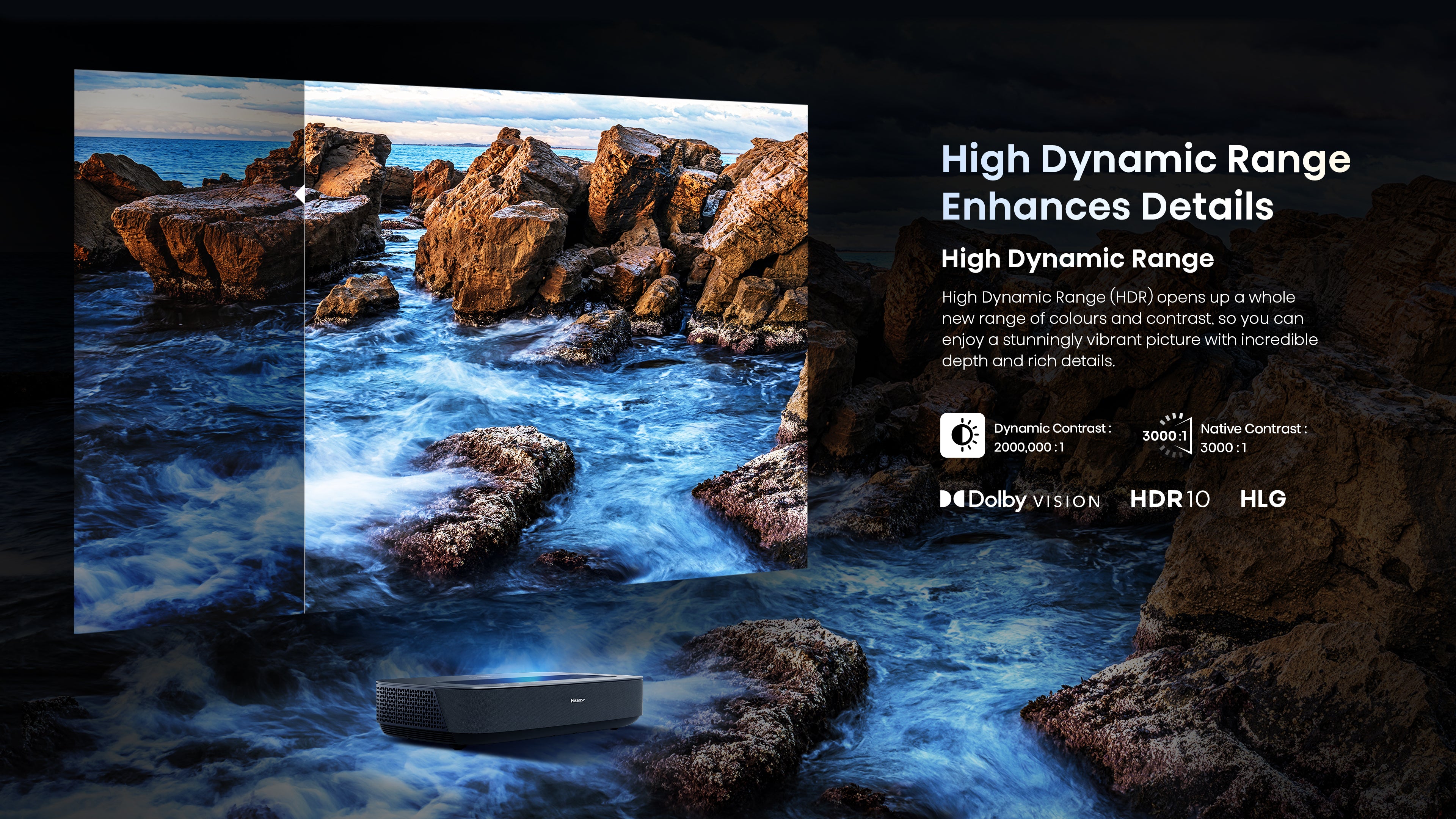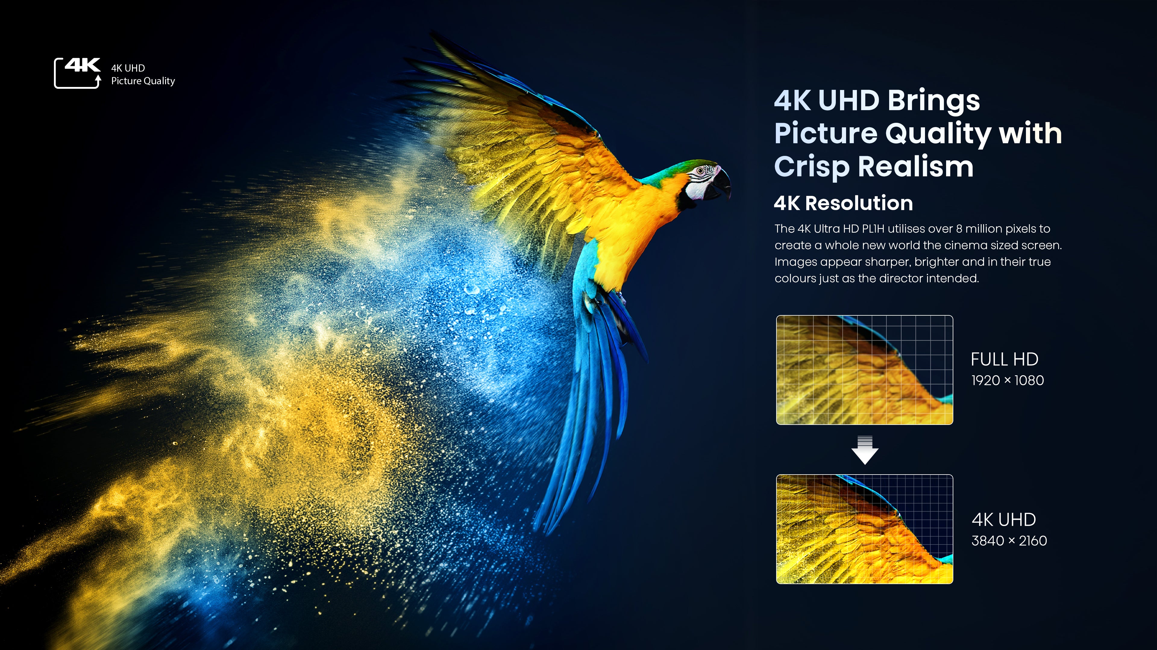 With 4K resolution, Dolby Vision HDR, HDR10, and HLG, the PL1 faithfully recreates a world of incredible color, depth, and detail.