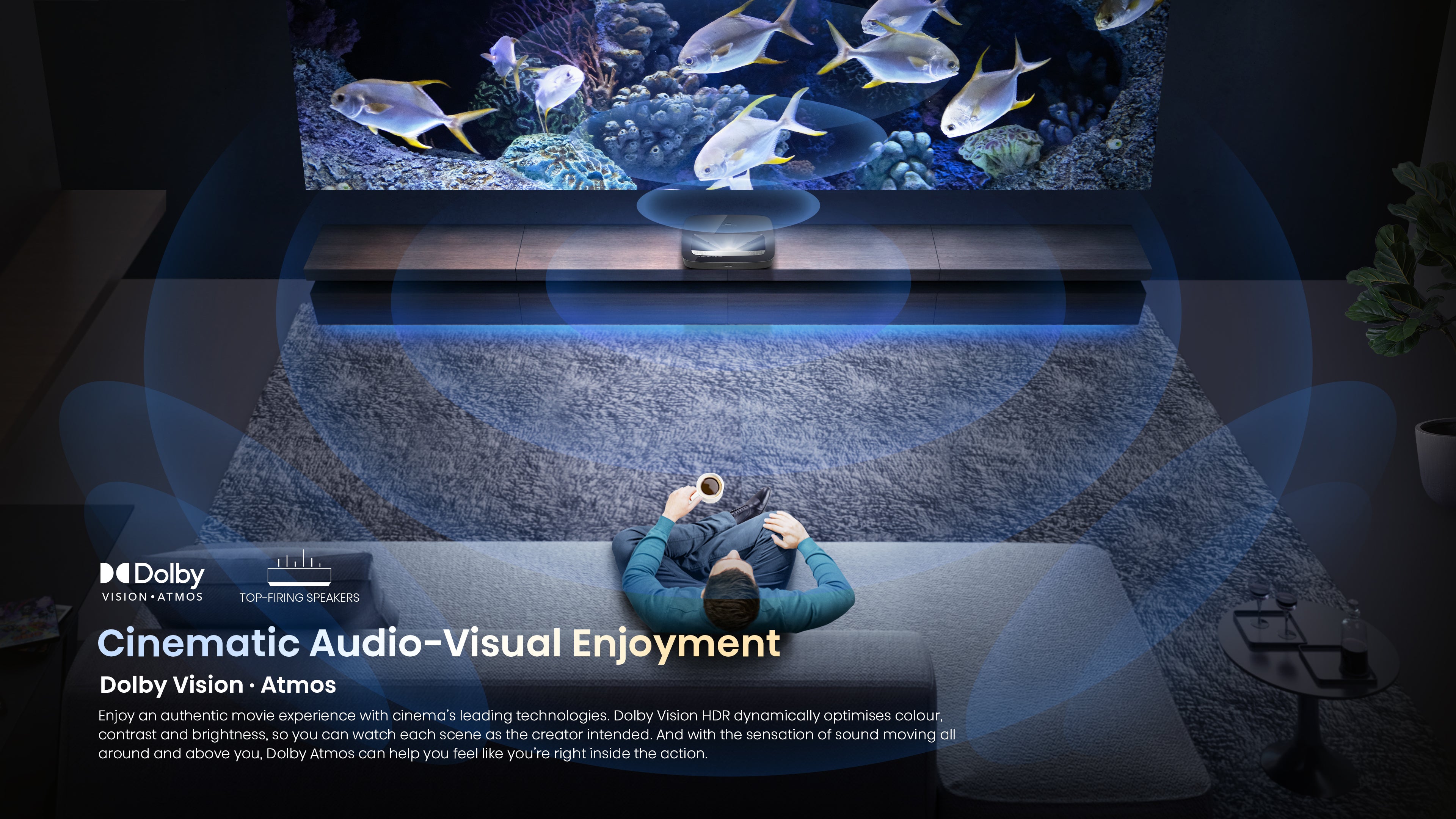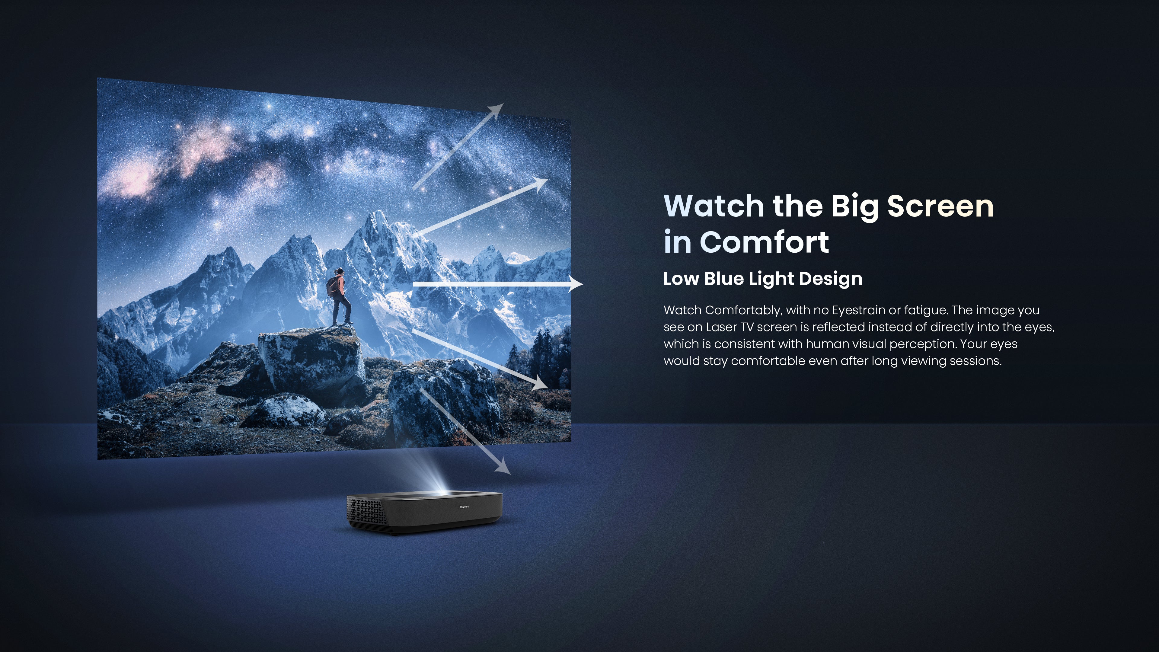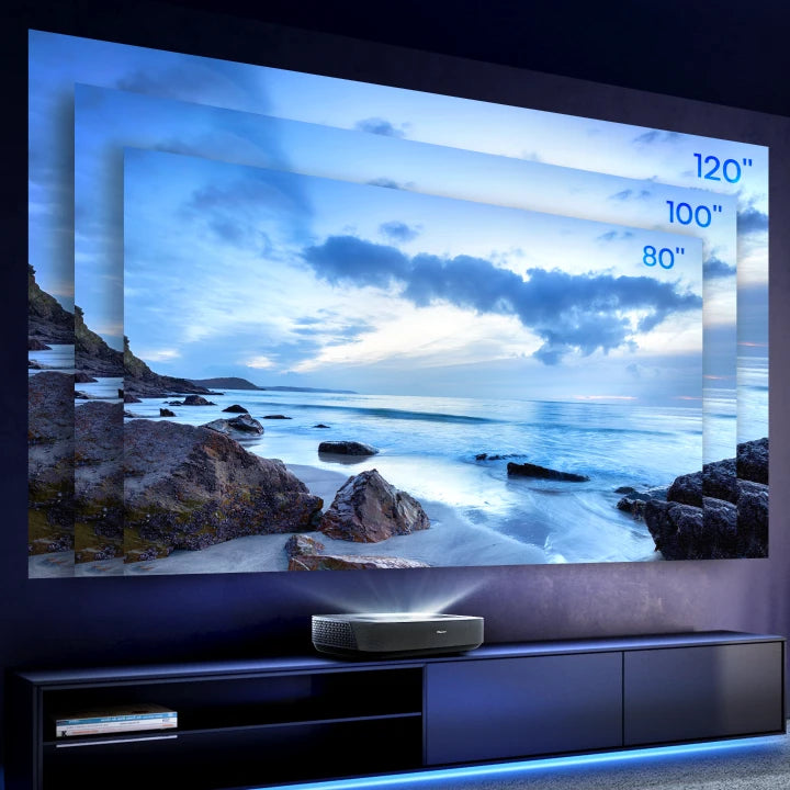 At mere inches from the wall, the laser console casts a massive projection in beautiful 4K resolution.