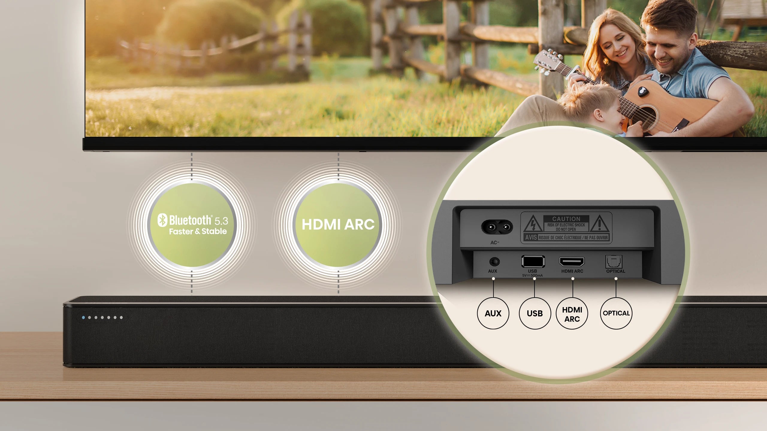 AUX, USB, HDMI ARC, OPTICAL