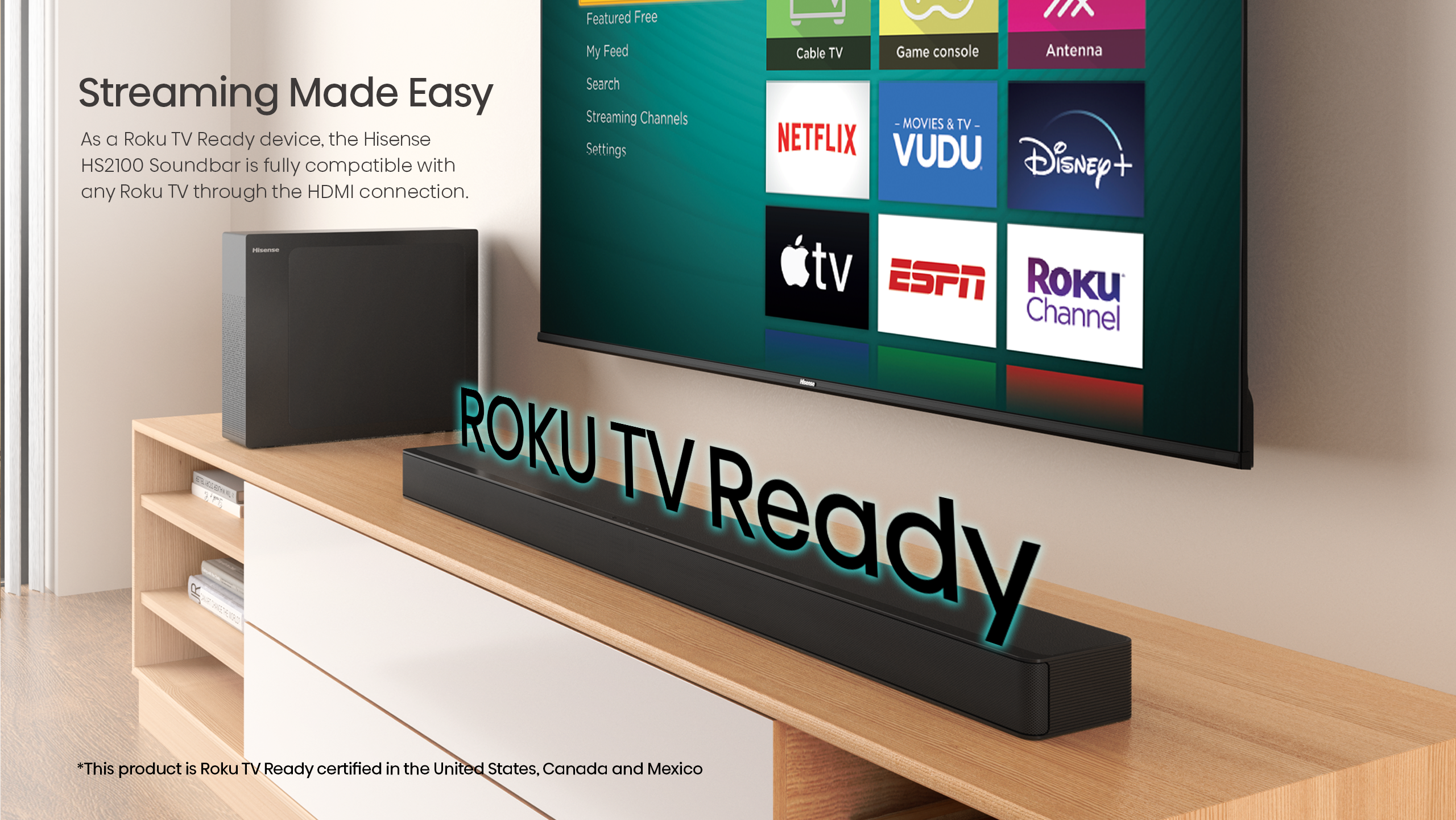 As a Roku TV Ready device, the Hisense HS2100 Soundbar is fully compatible with any Roku TV through the HDMI connection.